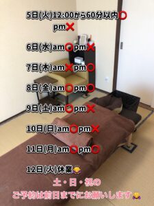本日の空き枠は12:00から60分以内のコースでおひとり様のみとなっております🙇♀️