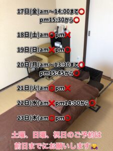 さて、明日からの予定です! ご予約、お問合せお待ちしております☆