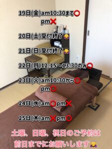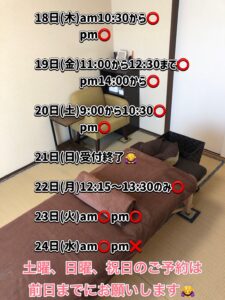 おはようございます♪本日、予約枠いっぱいとなっております🈵ありがとうございます😊電話に出られないタイミングが多いので、お問い合わせ、ご予約の連絡は、ホームページのお問い