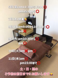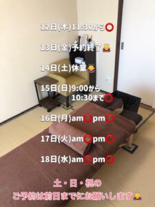 おはようございます😊早くからたくさんのお問い合わせをいただき、今日から日曜までのご予約が埋まっております🙇♀️※土曜日はお休