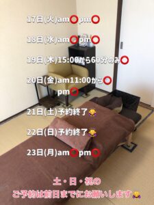 おはようございます♪文章の途中のまま施術に入り、1日が終わっている気がします💦こまめに更新がんばりたい💪さて、今週は事前予約がかなり増えており、当日のご予約が難しいかも